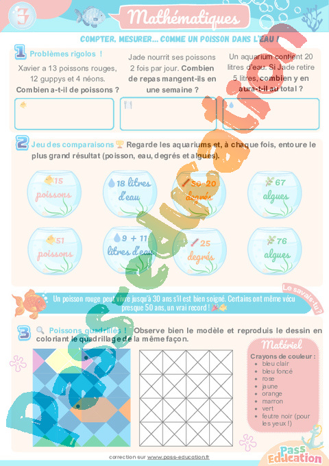Jeu des comparaisons 🏆 Regarde les aquariums et, à chaque fois, entoure le plus grand résultat (poisson, eau, degrés et algues).