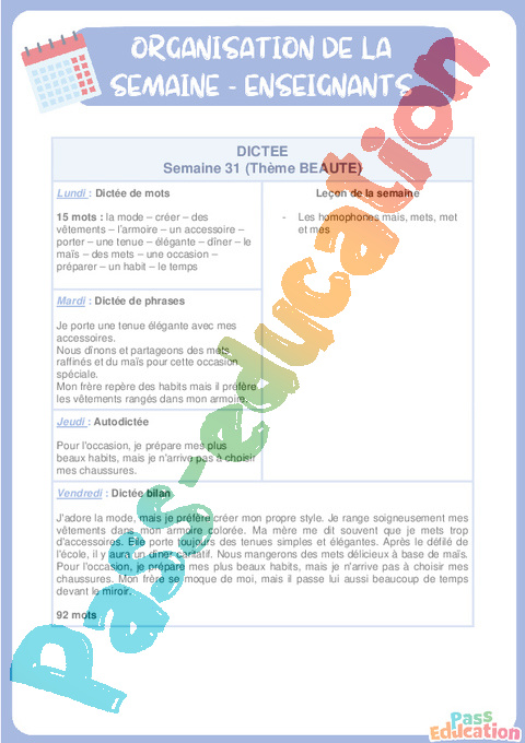 31. Semaine 31 Beauté : 5eme Primaire – Dictée progressive hebdomadaire (n°31) pdf