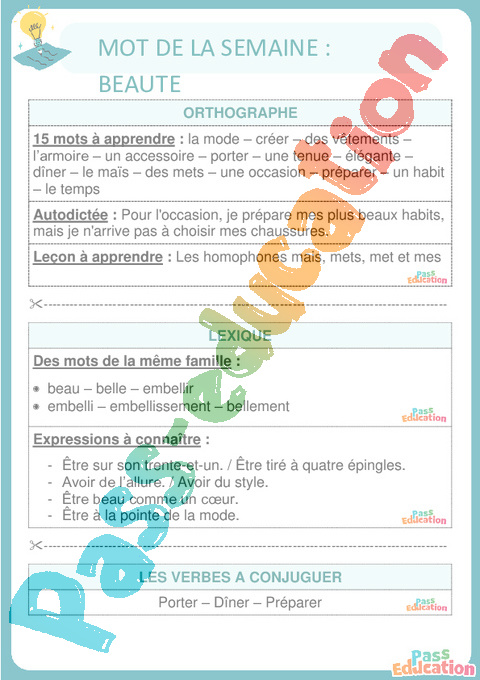 Correction Beauté : 5eme Primaire – Dictée progressive hebdomadaire (n°31) pdf