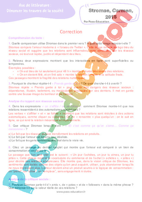 Correction Questionnaire Carmen (Stromae) : 3eme Secondaire pdf