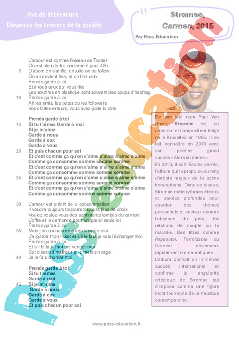 Littérature Carmen (Stromae) : 3eme Secondaire pdf