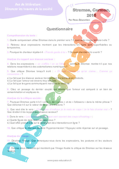 Correction Questionnaire Carmen (Stromae) : 3eme Secondaire rtf