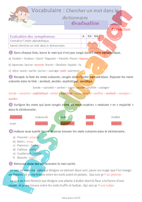 Correction Evaluation : 5eme Primaire Chercher un mot dans le dictionnaire pdf