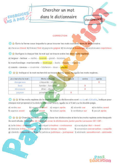 Correction Chercher un mot dans le dictionnaire : 5eme Primaire – Exercices Pas à Pas pdf