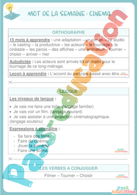 Dictée progressive hebdomadaire (n°7) en 5eme Primaire sur le thème de : Cinéma