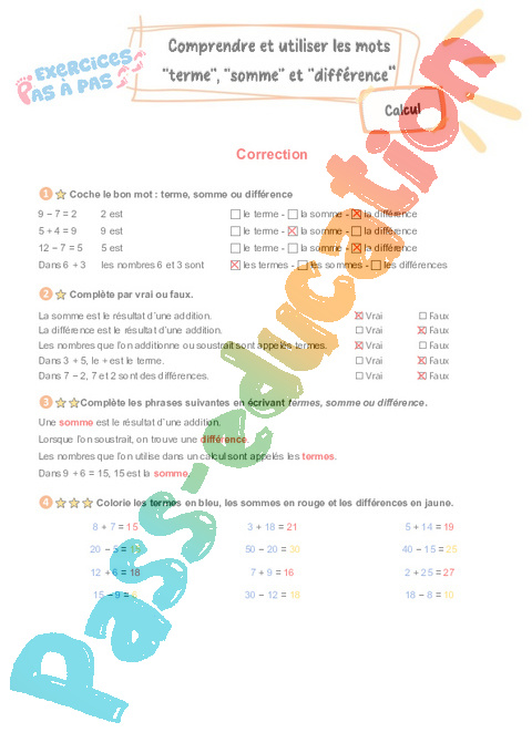 Comprendre et utiliser les mots terme, somme et différence : 3eme Primaire – Exercices Pas à Pas pdf