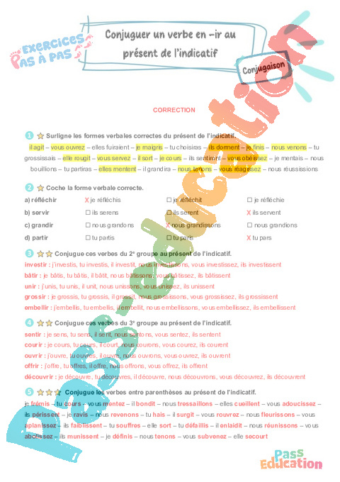 Correction Conjuguer un verbe en -ir au présent de l’indicatif : 5eme Primaire – Exercices Pas à Pas pdf