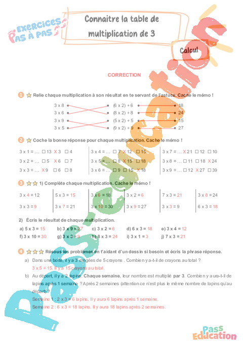Correction Connaître la table de multiplication par 3 : 3eme Primaire – Exercices Pas à Pas pdf
