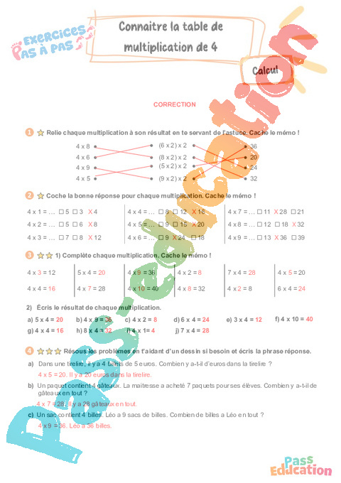 Correction Connaître la table de multiplication par 4 : 3eme Primaire – Exercices Pas à Pas pdf