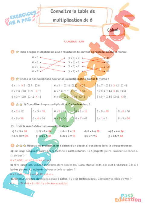 Correction Connaître la table de multiplication par 6 : 3eme Primaire – Exercices Pas à Pas rtf