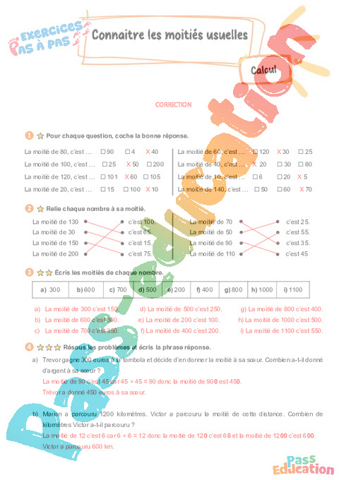 Correction Connaître les moitiés usuelles : 3eme Primaire – Exercices Pas à Pas pdf