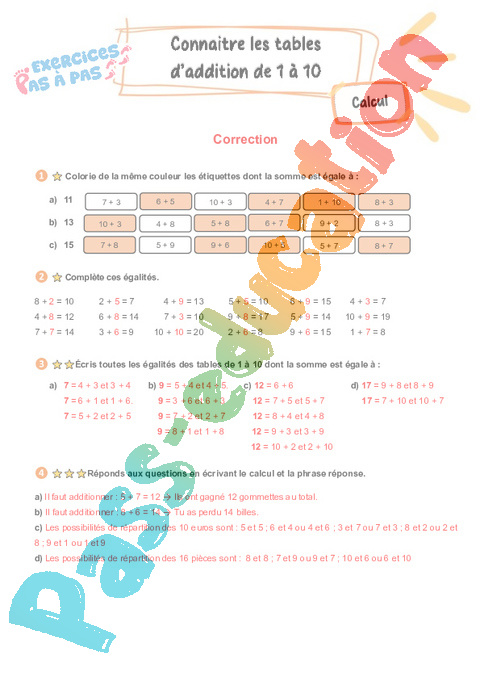 Correction Connaitre les tables d’addition de 1 à 10 : 3eme Primaire – Exercices Pas à Pas pdf