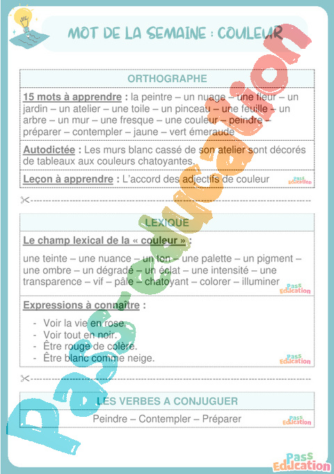 Dictée progressive hebdomadaire (n°22) en 5eme Primaire sur le thème de : Couleur
