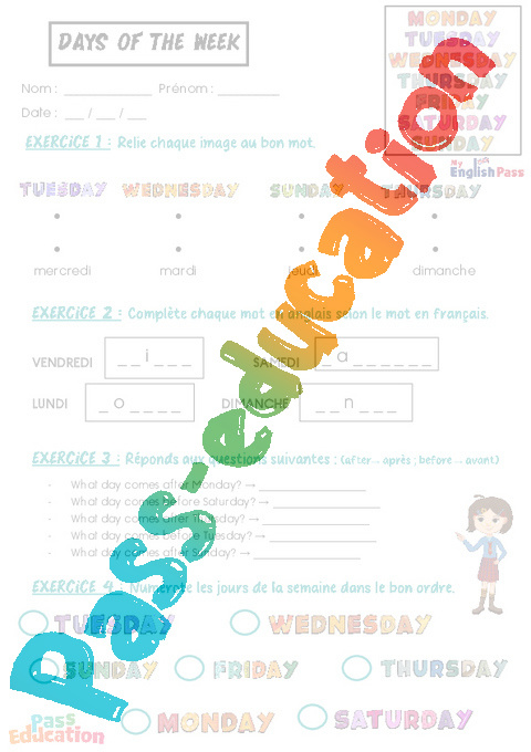 Exercice 4 : Numérote les jours de la semaine dans le bon ordre.