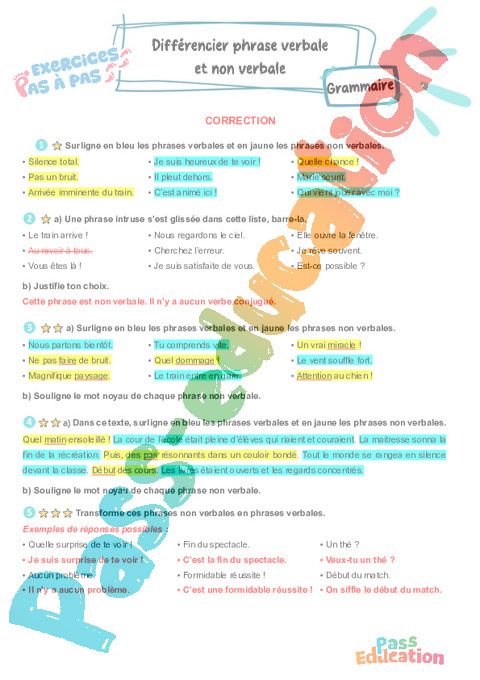 Correction Différencier phrase verbale et non verbala 5eme Primaire – Exercices Pas à Pas rtf