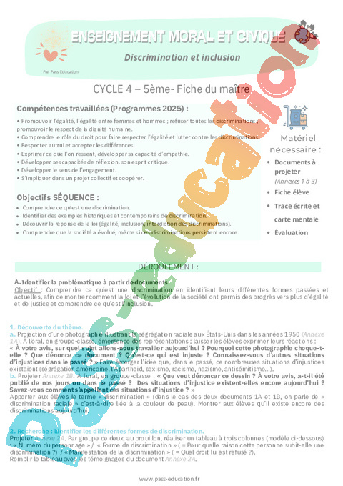 A. Objectif : Comprendre ce qu’est une discrimination en identifiant leurs différentes formes passées et actuelles, afin de montrer comment la loi et l’évolution de la société ont permis des progrès vers plus d’égalité et de justice et comprendre ce qu’est l’inclusion.