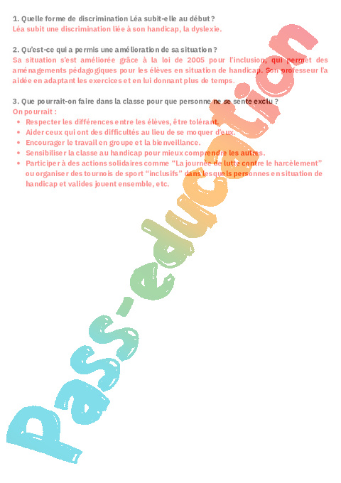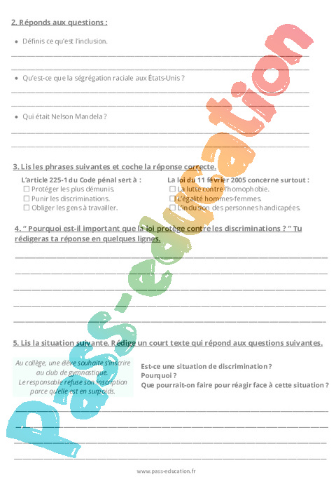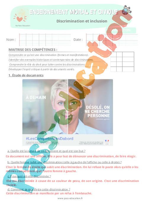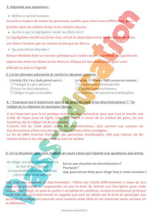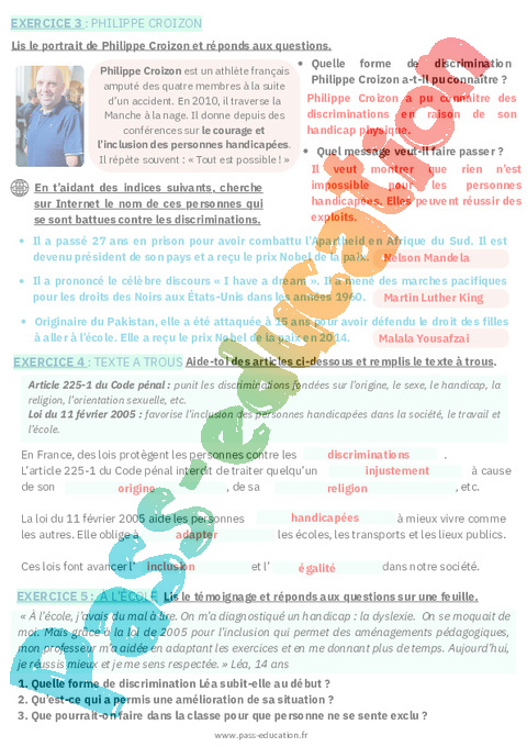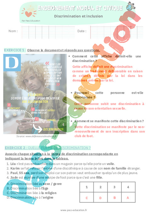 2. Correction Fiche Exercices Discrimination et inclusion : 1ere Secondaire pdf