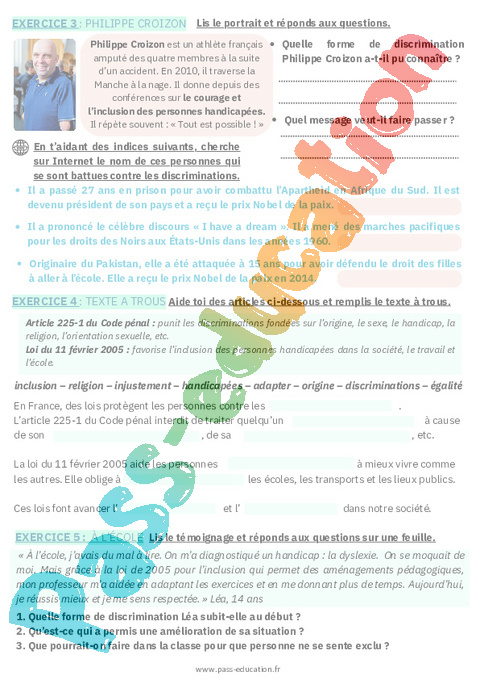 2. Fiche Exercices Discrimination et inclusion : 1ere Secondaire pdf
