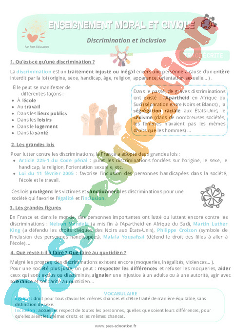 Séquence complète sur la discrimination et inclusion : 1ere Secondaire – EMC Education morale et civique.