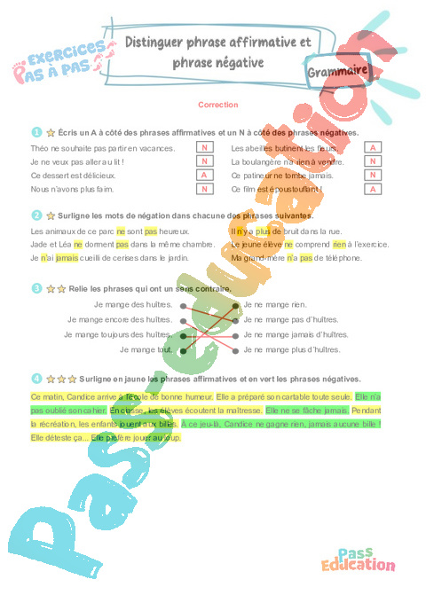 Distinguer phrase affirmative et phrase négative : 3eme Primaire – Mémo + Exercices Pas à Pas pdf