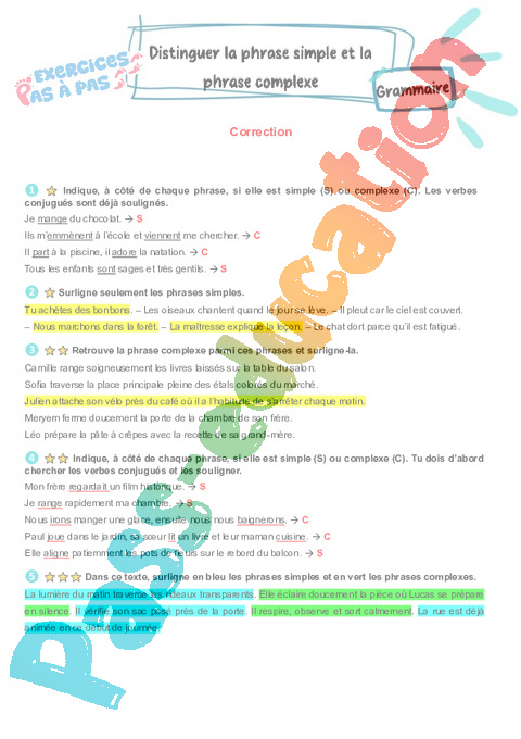 Correction Distinguer une phrase simple et une phrase complexe : 5eme Primaire – Exercices Pas à Pas pdf