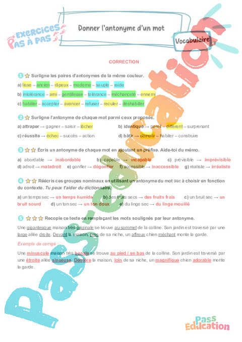 Correction Donner l’antonyme d’un mot : 5eme Primaire – Exercices Pas à Pas pdf