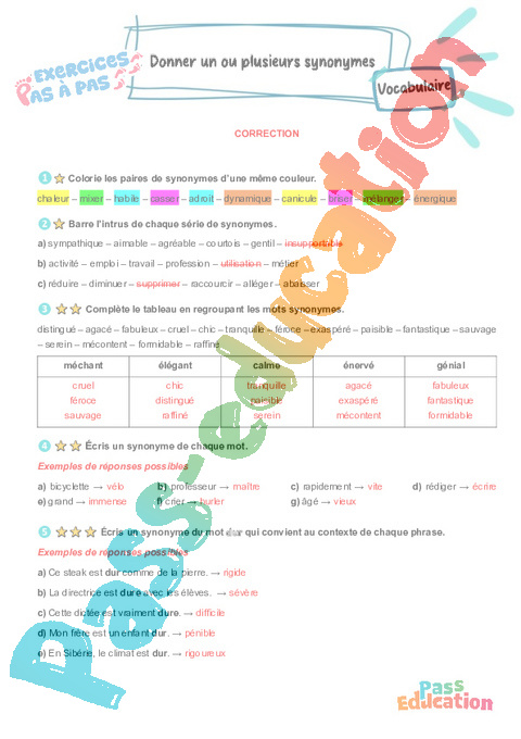 Correction Donner un ou plusieurs synonymes : 5eme Primaire – Exercices Pas à Pas rtf