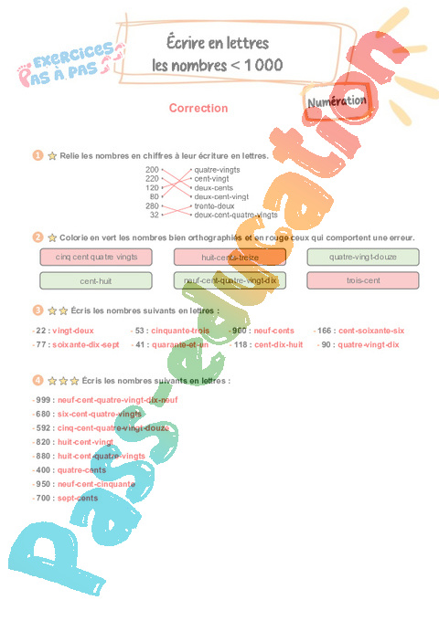Correction Écrire en lettres les nombres inférieurs à 1 000 : 3eme Primaire – Exercices Pas à Pas rtf