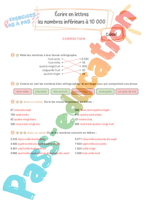 Correction Écrire en lettres les nombres inférieurs à 10 000 : 3eme Primaire – Exercices Pas à Pas rtf