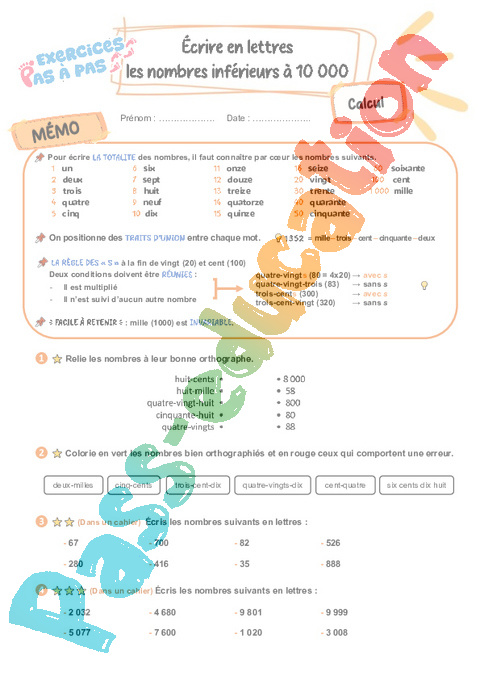 Exercices Pas à Pas avec mémo / leçon de numération pour travailler la compétence : Écrire en lettres les nombres inférieurs à 10 000 au : 3eme Primaire .