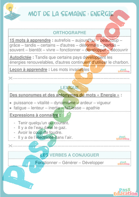 Dictée progressive hebdomadaire (n°9) en 5eme Primaire sur le thème de : Energie