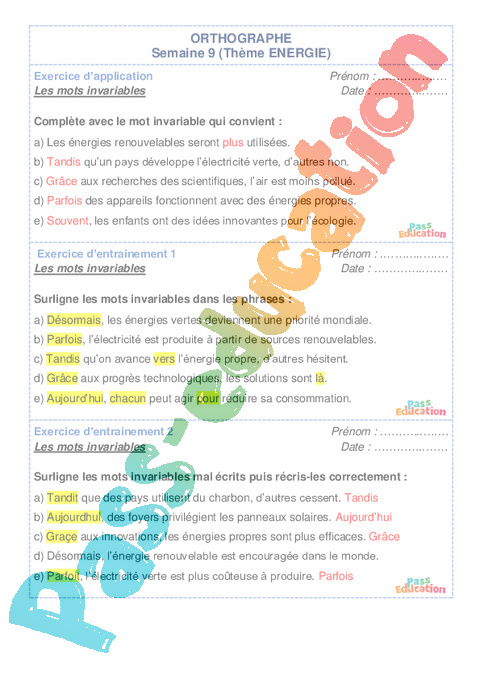 Correction 9. Semaine 9 Energie : 5eme Primaire – Dictée progressive hebdomadaire (n°9) pdf
