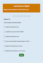Cet exercice en ligne de français en : 4eme Primaire permet de comprendre et d’appliquer les fonctions de l’adjectif, en particulier l’adjectif épithète et l’adjectif attribut du sujet. À travers des situations variées et progressives, l’élève apprend à identifier l’adjectif, à analyser sa place dans la phrase et à vérifier les accords en genre et en nombre. Ce travail consolide les bases de la grammaire du et favorise une lecture attentive des phrases, utile aussi bien en classe qu’à la…