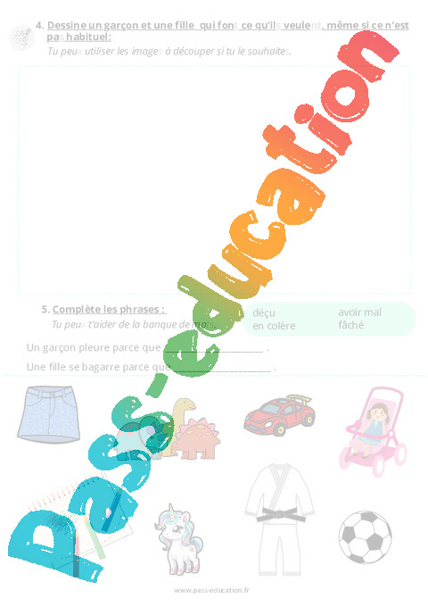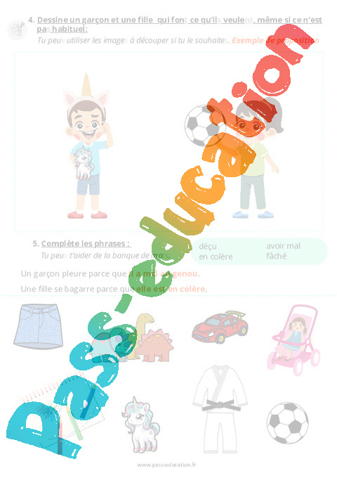 4. Dessine un garçon et une fille qui font ce qu’ils veulent, même si ce n’est pas habituel:Un garçon pleure parce que __.