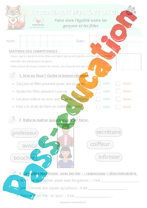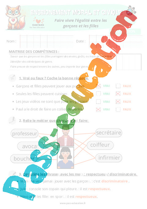 Évaluation à imprimer Faire vivre l’égalité entre les garçons et les filles : 1ere Primaire – EMC Education morale et civique