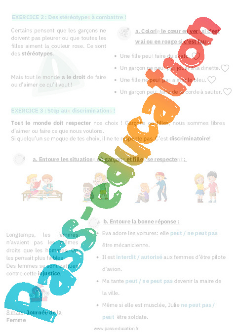 Exercices Faire vivre l’égalité entre les garçons et les filles : 1ere, 4eme Primaire – EMC Education morale et civique