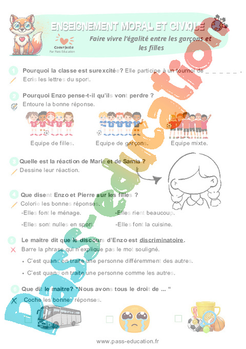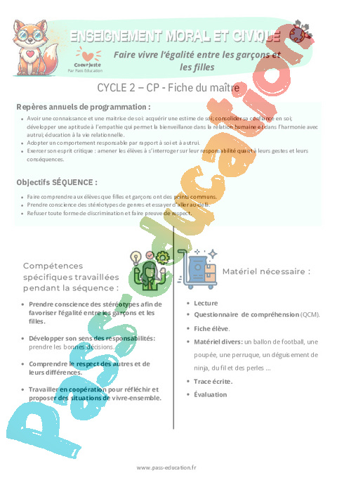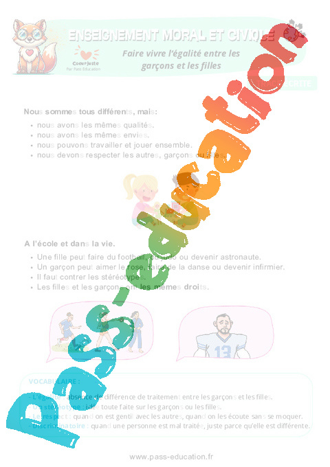 Fiche de préparation – Faire vivre l’égalité entre les garçons et les filles : 1ere Primaire – EMC Education morale et civique