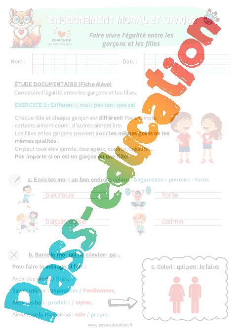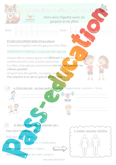 4 Fiche élève : 1ere, 4eme Primaire Faire vivre l’égalité entre les garçons et les filles pdf