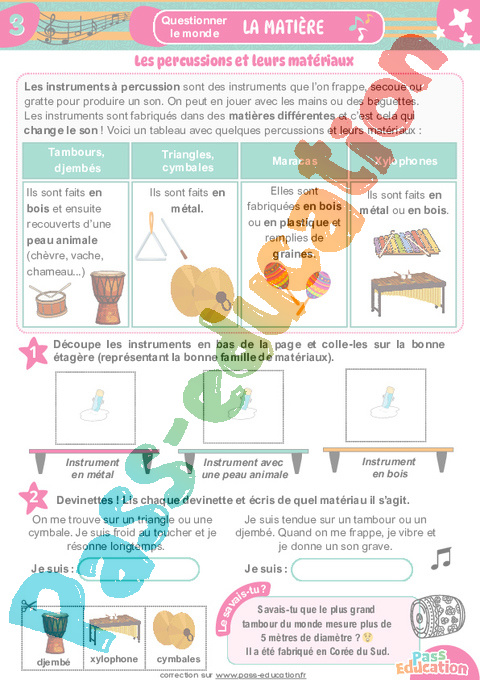 Les instruments sont fabriqués dans des matières différentes et c’est cela qui change le son ! Voici un tableau avec quelques percussions et leurs matériaux :