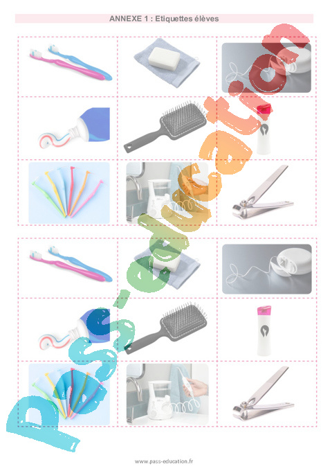 | – Voici quelques photographies. Ensemble, nous allons nommer ce que nous y voyons. L’enseignant présente une à une les images en grand format qu’il accroche au fur et à mesure au tableau. Les photographies représentent différents accessoires assurant l’hygiène du corps et plus spécifiquement des dents. – « Par deux, vous allez maintenant trier ces images en deux groupes : imaginez que vous devez les répartir dans deux sacs différents. Réfléchissez bien à quelles images vous pouvez mettre ensemble. » L’enseignant fait référence aux deux colonnes tracées au tableau, avec les images aimantées au-dessous. Les élèves disposent des reproductions de ces photographies en petit format, et devront les disposer d’un côté ou de l’autre de leur table. L’enseignant passe dans les rangs pour aider, favoriser l’échange entre les deux élèves, si nécessaire. | – Confrontation des classements réalisés par les élèves, l’enseignant assure l’échange oral entre les apprenants. Il prend en considération le travail des élèves et rebondit sur leurs réponses pour les amener au tri attendu. – Si aucun tri évoqué par les élèves ne correspond aux attentes, l’enseignant peut alors proposer son tri : « Vous avez fini de ranger toutes ces images. Je vais maintenant vous proposer mon propre tri, regardez. » L’enseignant dispose les photographies d’éléments d’entretien dentaire dans la première colonne et les autres éléments dans la seconde. – Pour nommer les colonnes, l’enseignant cherche à amener petit à petit les élèves à proposer du lexique qui peut s’approcher des réponses possibles : Il note tout ce que proposent les élèves dans chaque colonne. La vidéo qui suit permet d’amener une réponse à cette question et de nommer la colonne avec certitude. Pour introduire la suite de l’apprentissage sur la dentition, l’enseignant pointe la colonne des accessoires d’hygiène dentaire et interroge : – « Pourquoi faut-il entretenir ses dents ? » |