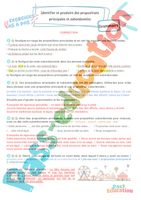 Exercices Pas à Pas avec mémo / leçon de grammaire pour travailler la compétence : Identifier et produire des propositions principales et subordonnées au : 5eme Primaire .