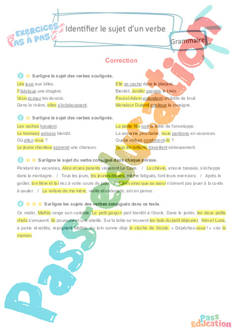Correction Identifier le sujet d’un verbe : 3eme Primaire – Exercices Pas à Pas rtf