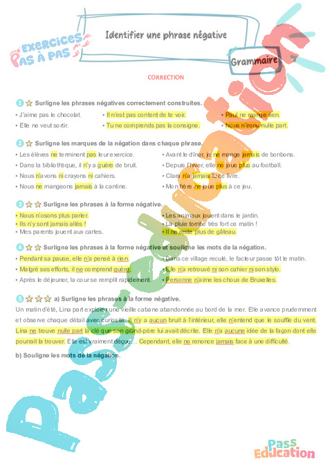 Correction Identifier une phrase négative : 5eme Primaire – Exercices Pas à Pas pdf