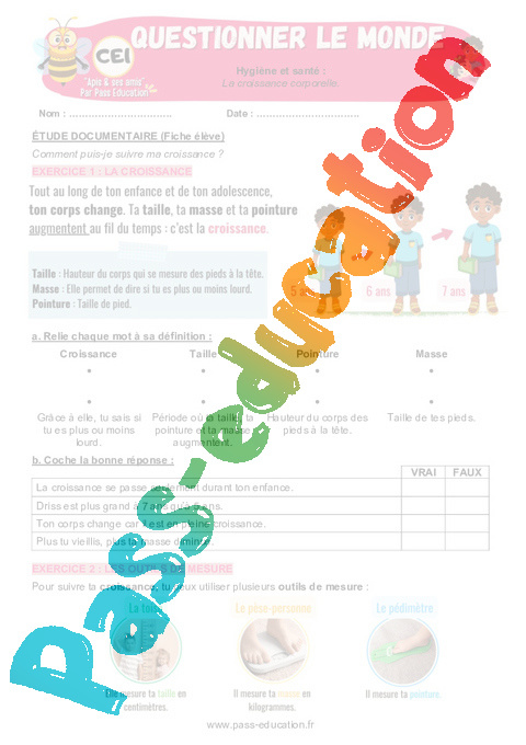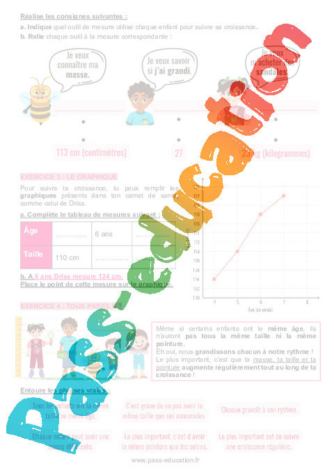 Exercices – La croissance corporelle en 2eme Primaire – Apis & ses amis : Questionner le monde.