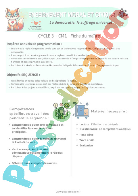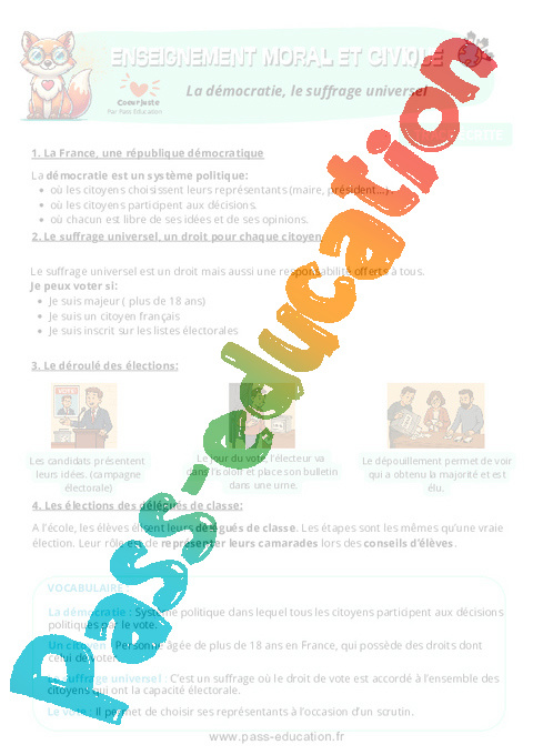Fiche de préparation – La démocratie, le suffrage universel : 4eme Primaire – EMC Education morale et civique.