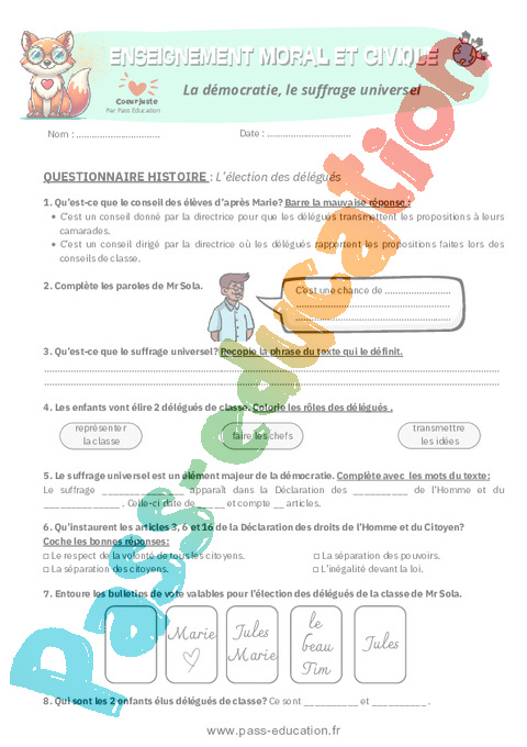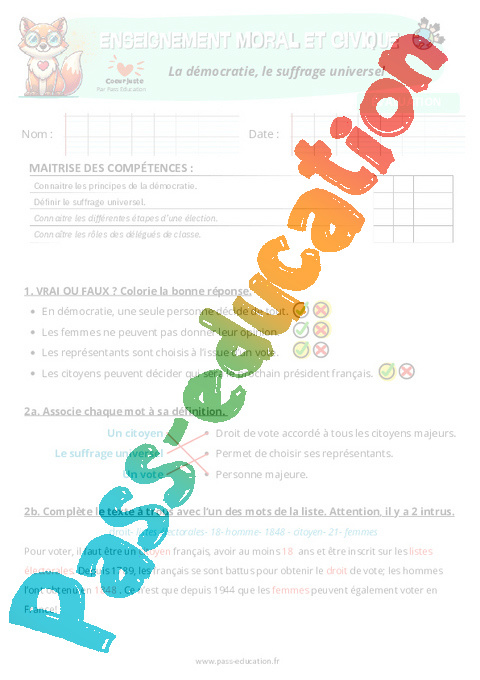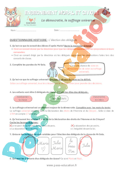 6. Correction Fiche évaluation La démocratie, le suffrage universel - EMC : 4eme Primaire pdf