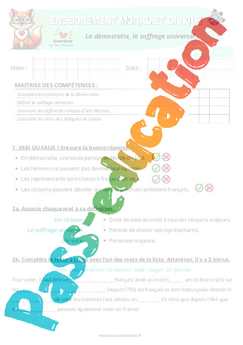 6. Fiche évaluation La démocratie, le suffrage universel - EMC : 4eme Primaire pdf