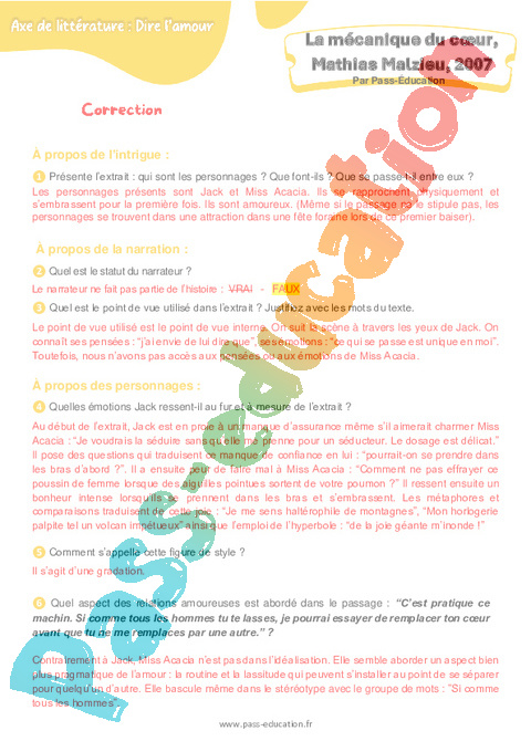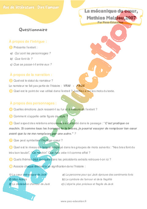 Correction Questionnaire : 2eme Secondaire La mécanique du cœur (Mathias Malzieu) pdf