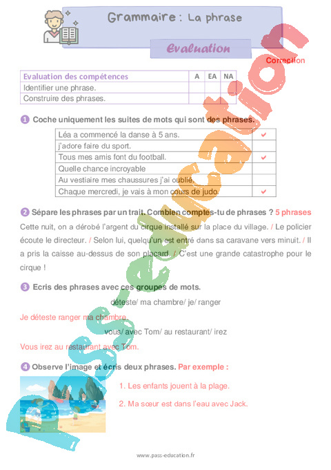 Correction Evaluation La phrase : 2eme Primaire pdf