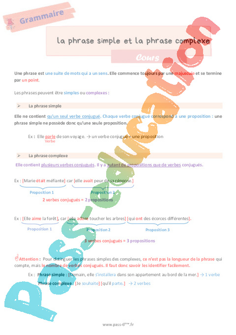 Cours de grammaire sur la phrase simple et la phrase complexe en 6ème.